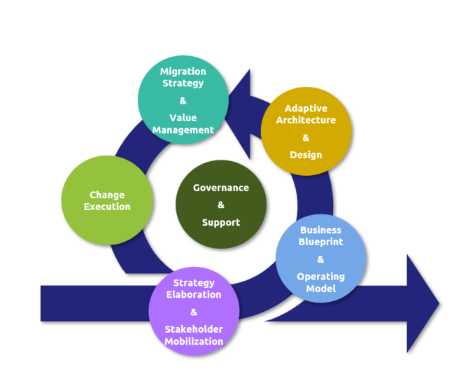 The following list explains the main structure. The dark blue “loop” in the background emphasizes the iterative and incremental nature of digital transformation. We believe it is not a matter of “making a plan, executing it, and back to business as usual”.