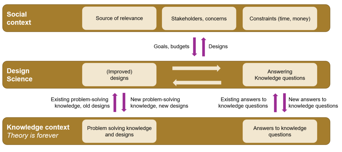 - Design science: This is where we want to create (improved) designs to meet the goals from the social context, within the constraints that are set, and leveraging insights from the knowledge context. Note that design questions have many underlying knowledge questions. For example, if we do want to improve a business process by addressing the underlying data flows, we would want to know what patterns have already been researched, before we start designing our own.